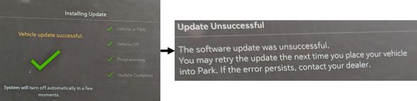 - A good connection to the vehicle is needed to process the update. Does the vehicle have connectivity? Is the vehicle parked in the open?